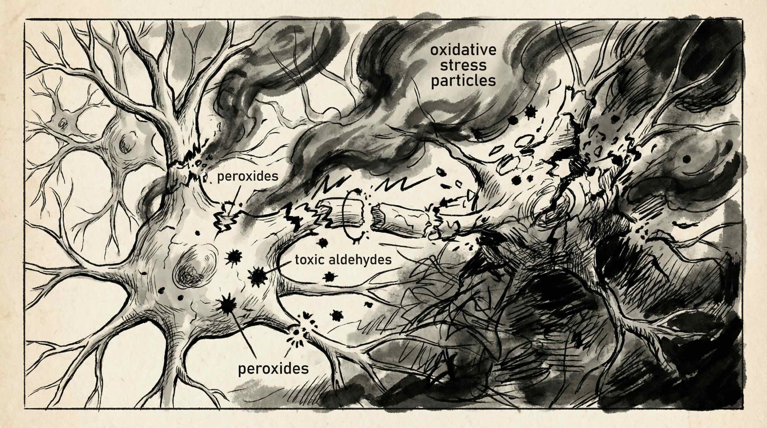 脳は体内で最も脂質に富んだ臓器の一つであり、その約60%が脂質で構成されています。そして、脳内のプーラ(多価不飽和脂肪酸)が酸化されると、アルデヒド(過酸化脂質)という有毒な代謝物が生成され、神経細胞の膜を損傷し、炎症を促進し、最終的には神経変性疾患を引き起こします(4,5)。