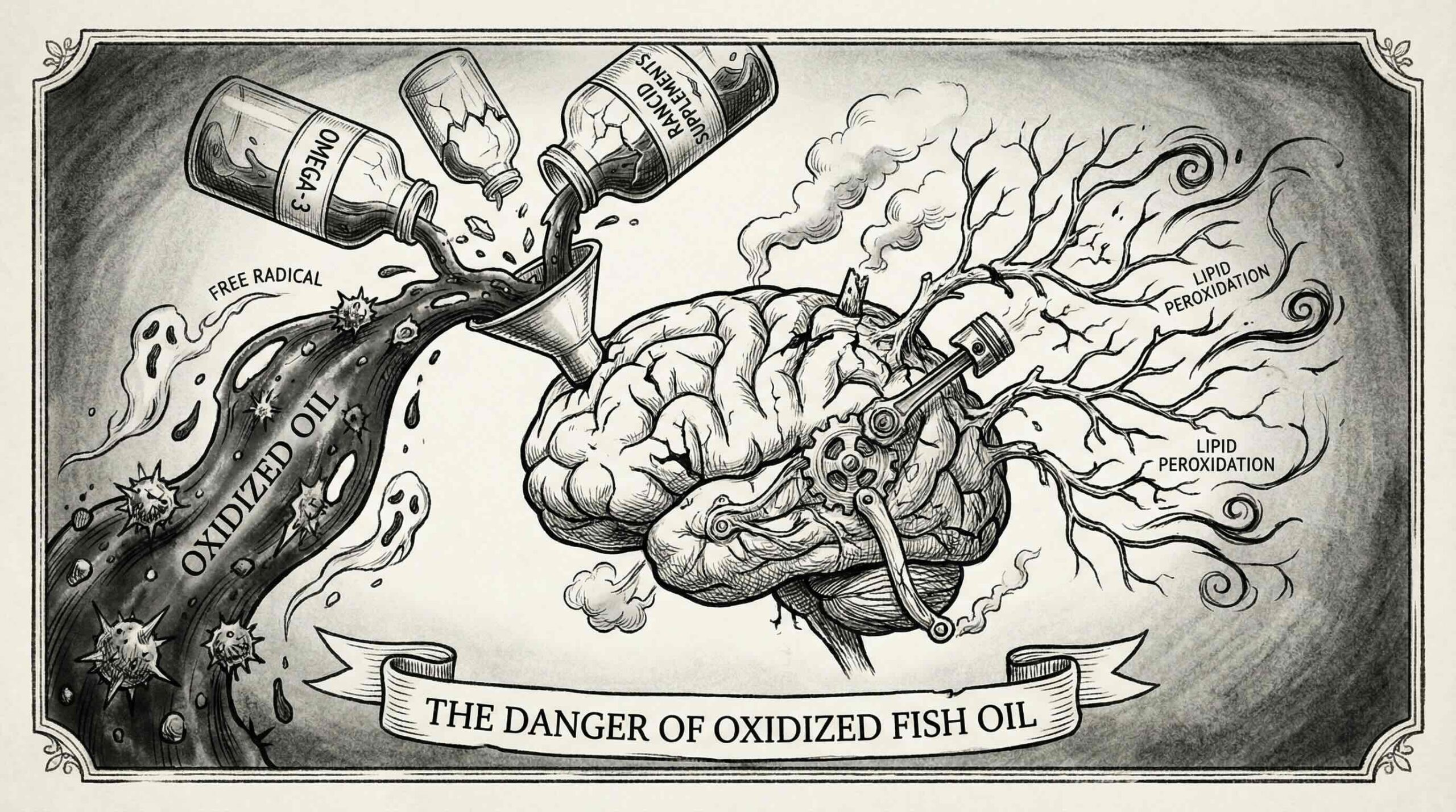 酸化した魚油を摂取することは、まさに「錆びた燃料」を脳に注ぎ込むようなものです。2012年の研究では、魚油(EPAとDHA)の補給がラットの脳組織において脂質過酸化のレベルを変化させることが示されています(19)。