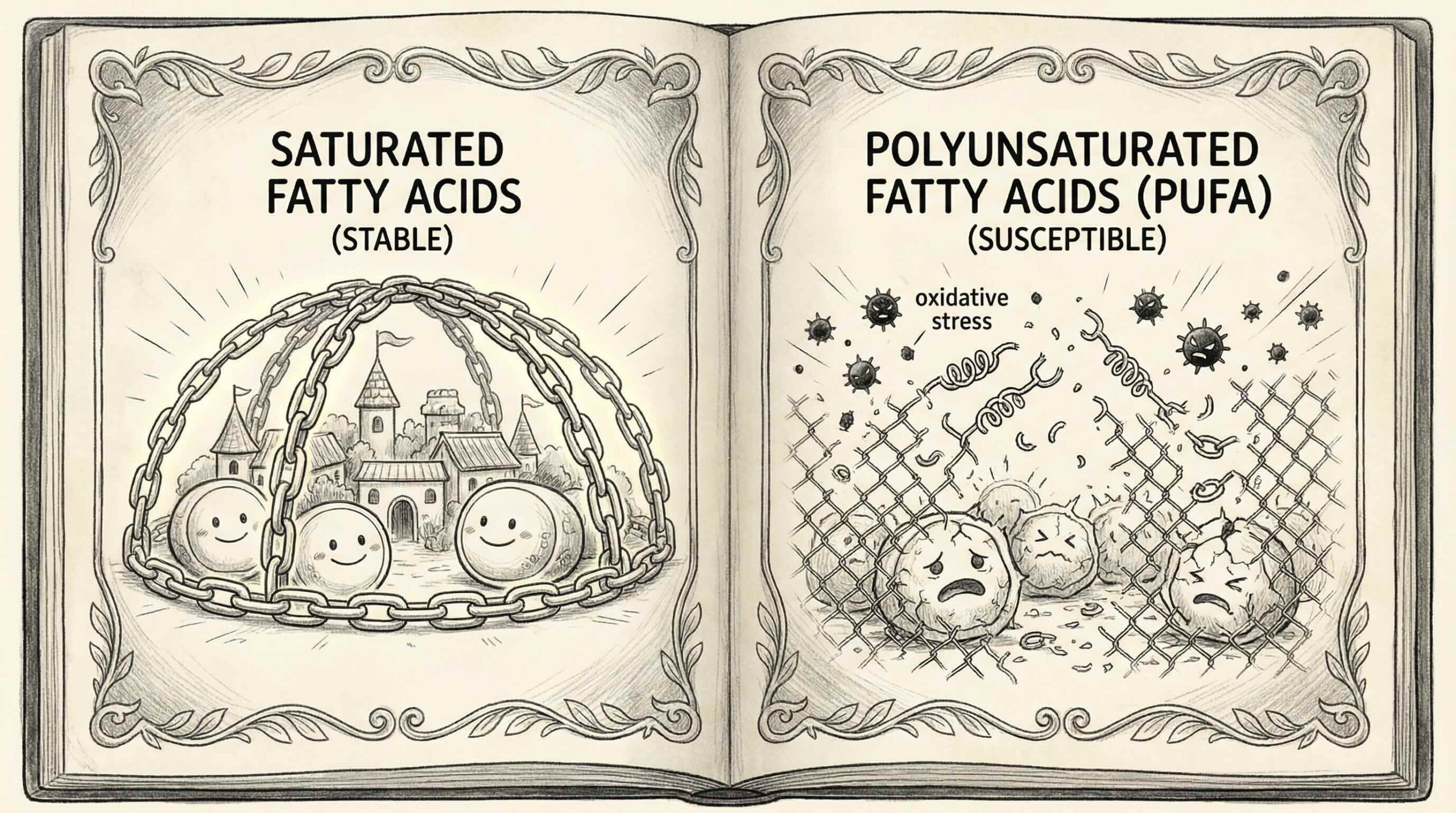 その鍵は、脂肪酸が「酸化されない」ことにあります。飽和脂肪酸は、その化学構造上、二重結合を持たないため非常に安定しており、酸化ストレスに対して抵抗力があります。これは、錆びにくい金属のようなものです。