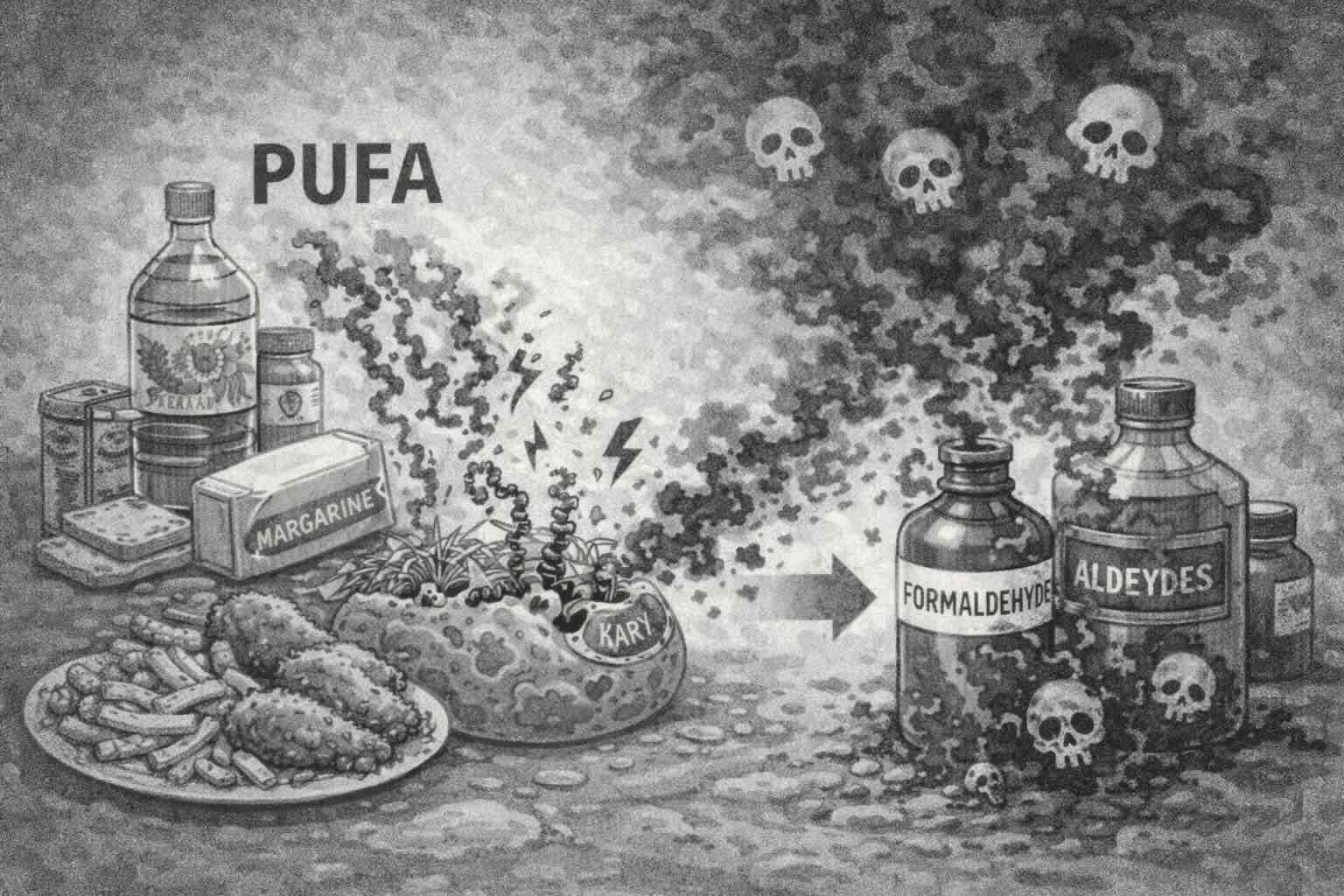 現代の食事は、かつてないほど多くのプーファ(多価不飽和脂肪酸)を含んでいます。植物油、マーガリン、加工食品に大量に含まれるこれらの脂肪酸は、体内に蓄積し、ストレスや炎症、加齢によって酸化され、ホルムアルデヒドを含む様々な有毒なアルデヒド類を生み出します(9,10)。この視点から見ると、うつ病の増加は、単なる心理的な問題ではなく、糖尿病などと同じ現代の食生活がもたらした「代謝の病態」として理解することができるのです(14)。