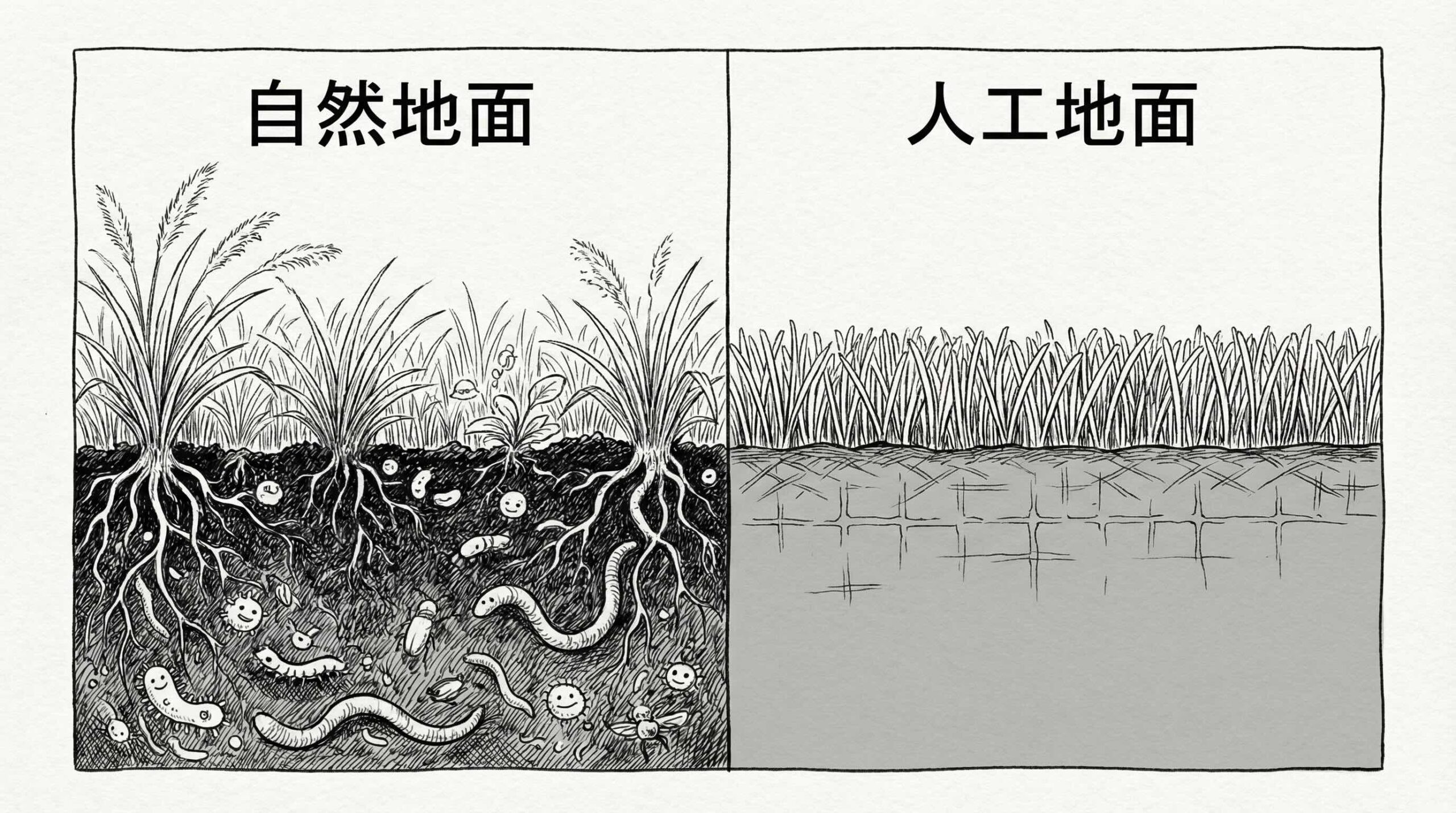 土壌中の微生物生態系を維持し、雨水を自然に浸透させ、地下水を涵養します。子どもたちは本物の自然と触れ合い、季節の移り変わりを感じることができます。これらは経済的な数値には表れませんが、私たちの環境と健康にとって計り知れない価値があります。