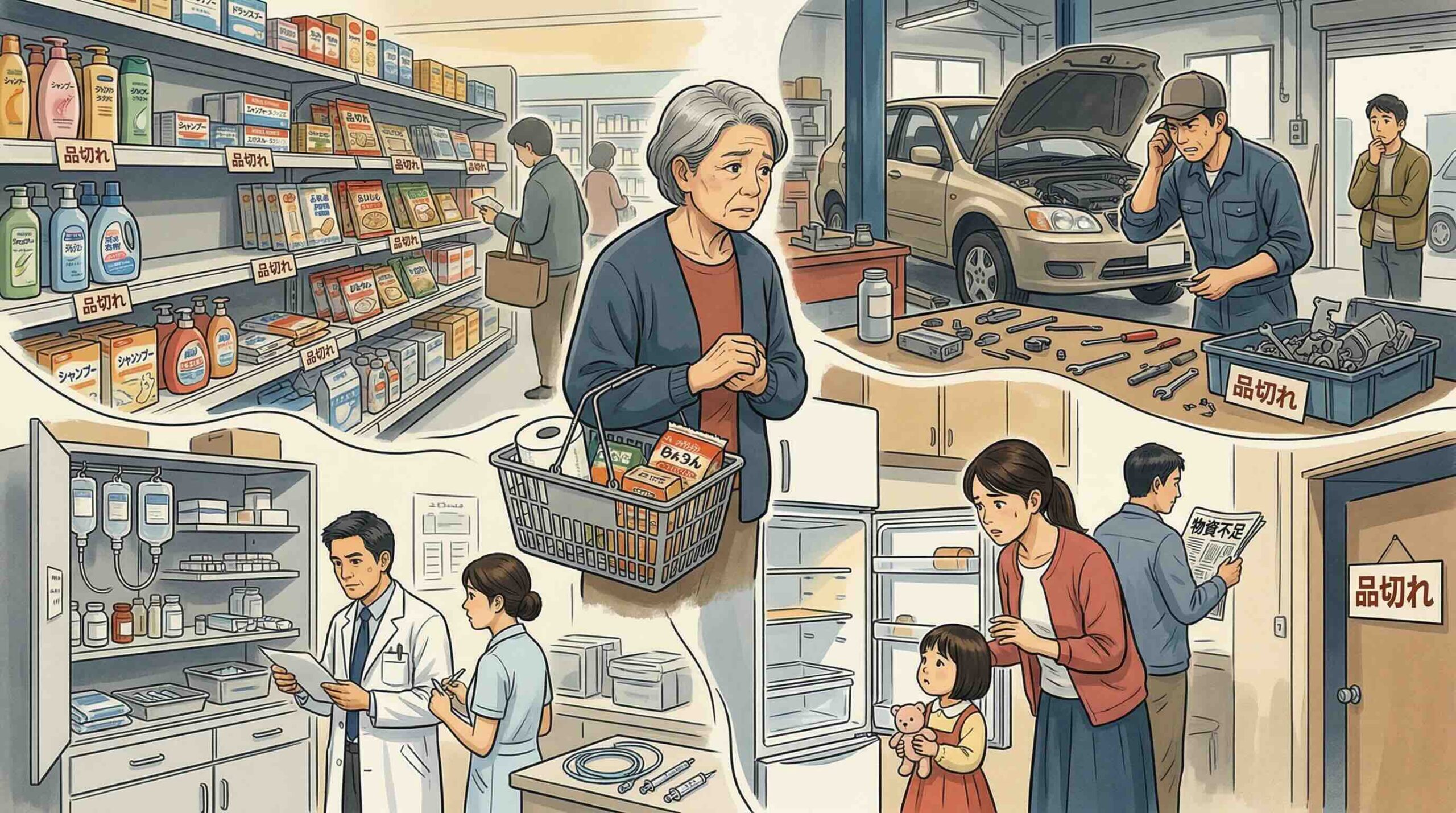ナフサは、石油化学製品のほとんどの出発点となる基礎原料です。その供給が揺らぐということは、日用品、家庭用品、衣類、電子機器といった、生活のあらゆる場面に影響が波及するということを意味します。スーパーの棚に並ぶ商品から、住宅、クルマ、病院の機器に至るまで、じわじわと「目に見える形」で表れてくる段階に入っています。