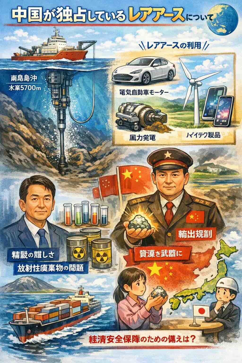 中国が事実上、独占しているレアアースについて興味深い記事(『日本のレアアースに勝算は──中国の輸出規制、南鳥島の試掘成功をどう見るか』 yahoo ニュース、4/10(金))が掲載されていましたので、その内容を忘備録としてまとめたいと思います。