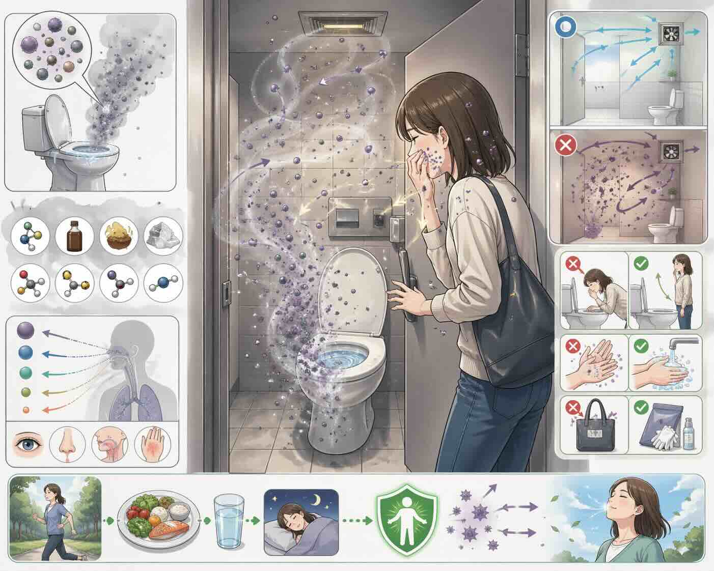見た目は綺麗でも、流した瞬間に立ち上がる細かな粒子や、尿や便に由来する刺激性の成分、さらに不十分な換気によってその場に居残る空気のよどみ(吐いた息や体全体から揮発する成分など)は、私たちの鼻、のど、目、皮膚に静かに触れてきます[1][2][3]。